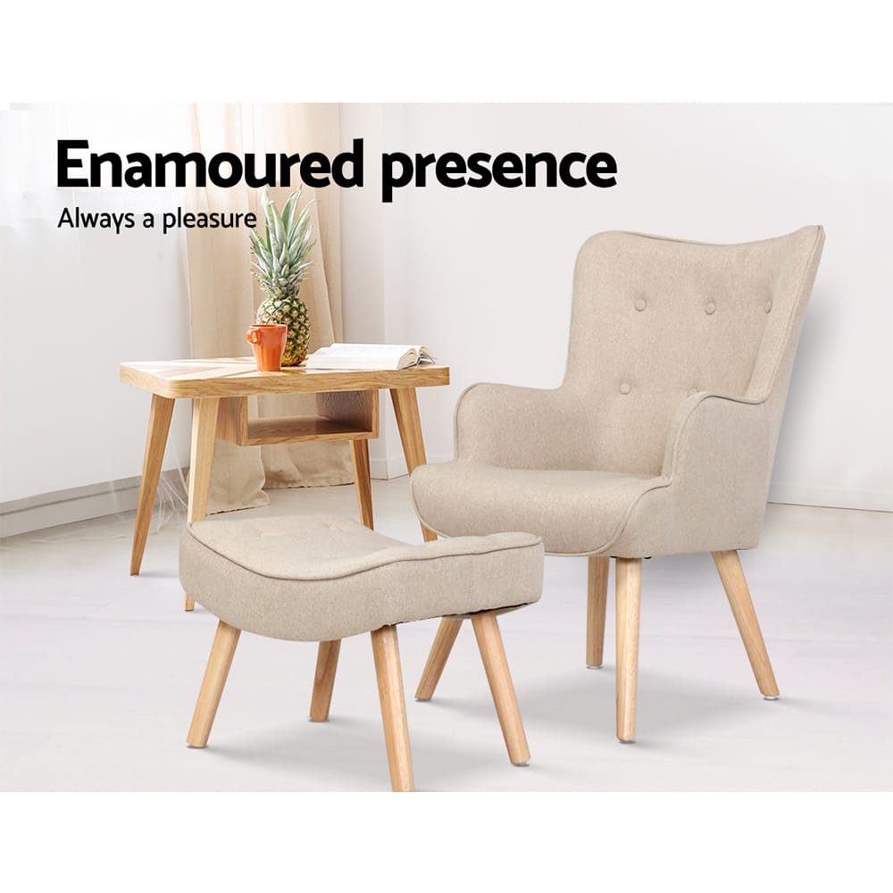 An iconic design that will stand the test of time and taste. The Lansar Armchair and Ottoman is a perfect ensemble to incorporate charm and chic to your home or in any room. With its meticulous craftsmanship, the Armchair is upholstered in premium linen fabric with a rich high resilience foam padding for comfort. The tufted design also adds an extra elegance, Likewise, the Ottoman also shares the same attributes. Not least, the sturdy rubber wood legs are splayed to give the Armchair and Ottoman not only better support and durability but also a unique stance from any angle. Form and function never looked better than with our Scandinavian-inspired Lansar Armchair and Ottoman. Get yours today.