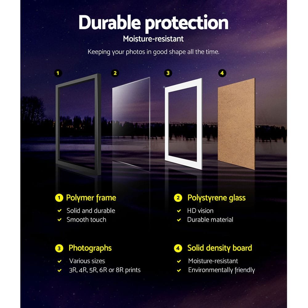 Every picture tells a story. And we are sure your extensive photo collection has lots to tell. So why not frame up the interesting ones on the wall and share the stories behind them to friends and family. You can do that beautifully with our charming Photo Frame Set. Available in a set of 26, our set allows your walls to be graced with fascinating stories and memorable moments from your treasured photographs. Arrange them in any way you like. Portrait or landscape, the framed photo feature wall is a conversational piece in its own right. Suitable for a range of photograph sizes from 3R to 8R, the frames feature a durable polymer construction with a polystyrene glass to keep your prints in good shape. The hardboard backing is also moisture-resistant. Hanging accessories are also included with your purchase.